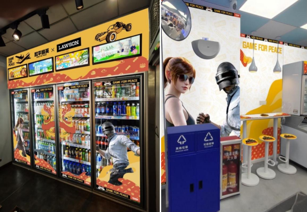 走进罗森主题门店,仿佛有一种穿越回游戏世界的即视感:玩家们熟知的吉利姐、舰长坐镇主场,经典的空投箱、游戏载具元素也出现在墙面、饮料柜等区域,店内还贴满了传统中国新春的“舞狮”元素,浓浓的新年气氛像是下一秒就要端菜“吃鸡”,沉浸式打造出属于和平世界的新春年味。