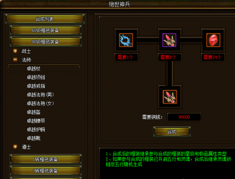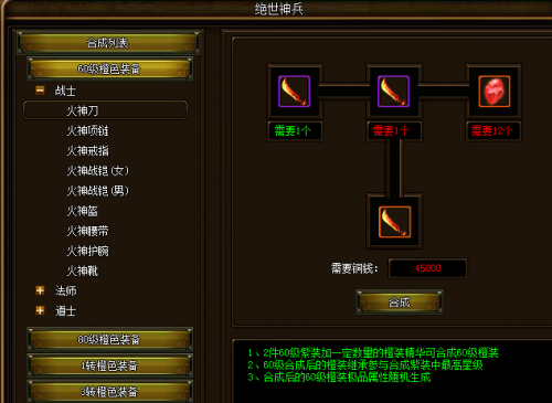1.2件40级的紫装 + 一定数量的橙色精华,消耗一定的铜钱,即可合成60级的橙色装备;