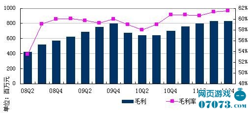 毛利润为8.34亿元人民币(1.32亿美元),较去年同期增长19.0%,较上季度增长0.5%;2011年第四季度毛利率为61.5%,去年同期为60.8%,上季度为61.3%。