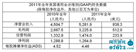 盛大游戏2011年全年净营业收入达到52.82亿元人民币(8.38亿美元),较去年增长17.3%。中国地区网络游戏净营业收入为49.76亿元人民币(7.90亿美元),较去年增长15.2%。净利润为12.65亿元人民币(2.01亿美元),较去年下降1.9%。毛利润为32.26亿元人民币(5.12亿美元),较去年增长20.9%。运营利润为14.74亿元人民币(2.34亿美元),较去年增长10.6%。